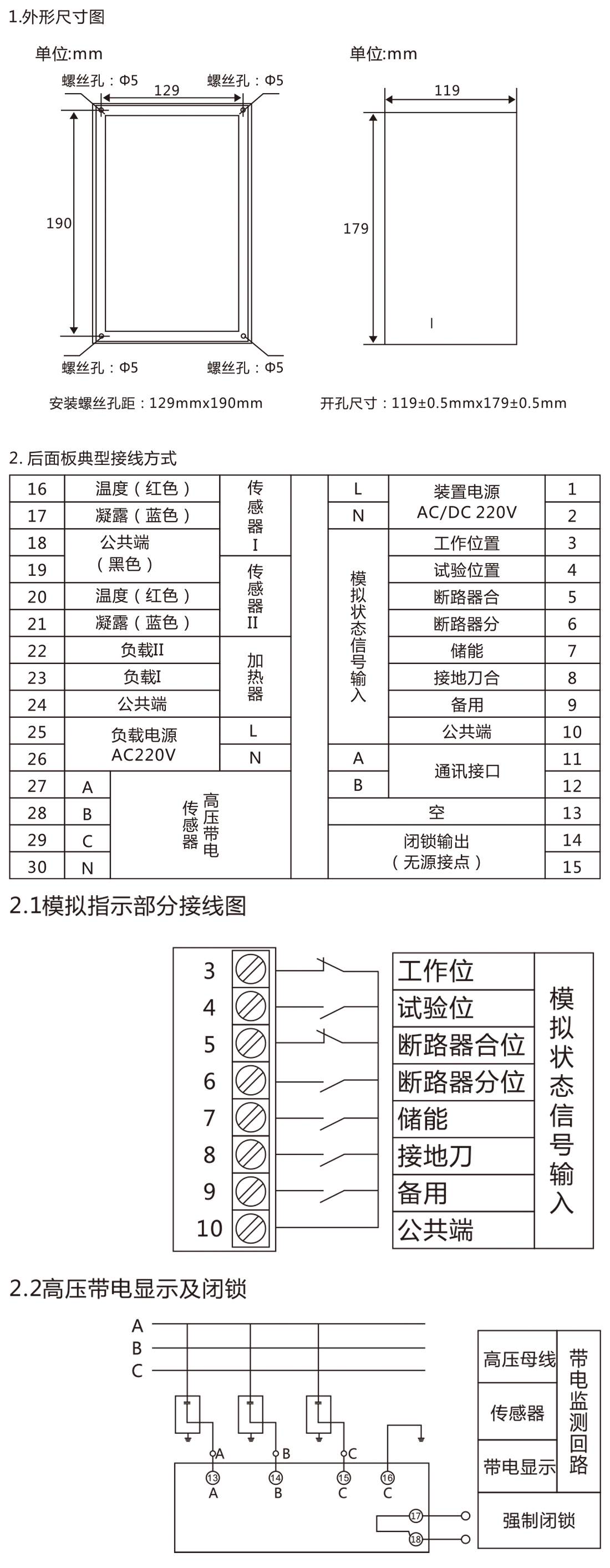 它集成了一次回路模拟图显示、断路器位置、手车位置或隔离刀位置、接地闸刀位置、弹簧储能位置、高压带电指示高压带电闭锁控制以及自动(手动)加热除湿控制等多功能于一体,这些指示功能可分可合,用户可根据需要选择。只要指定不同的订货型号并提供一次方案图即可。